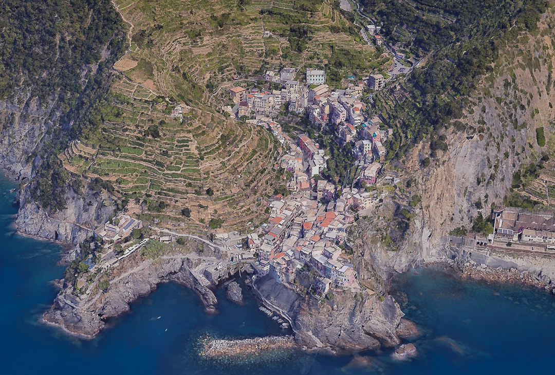 Google Earth image of Manarola. The train station is visible at the bottom right corner of the image.