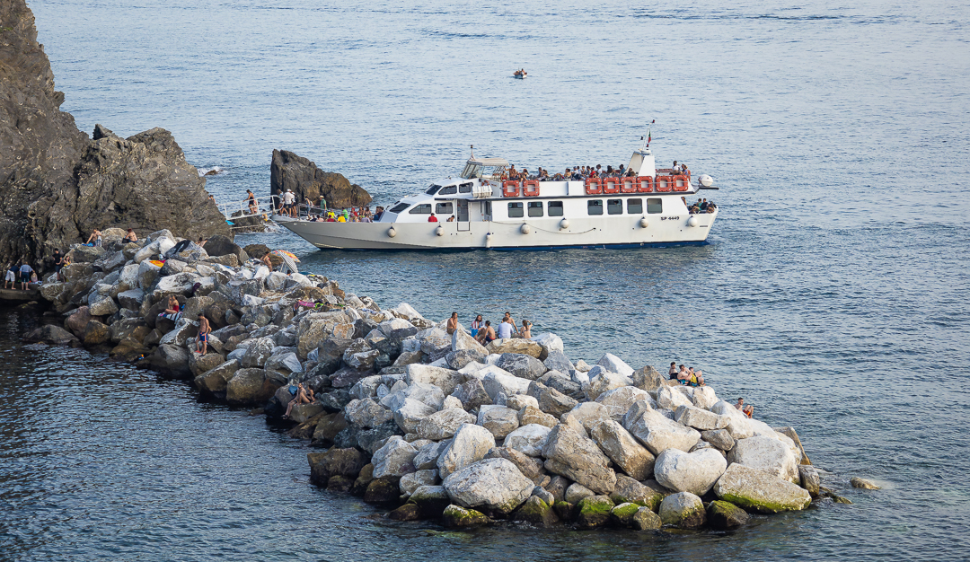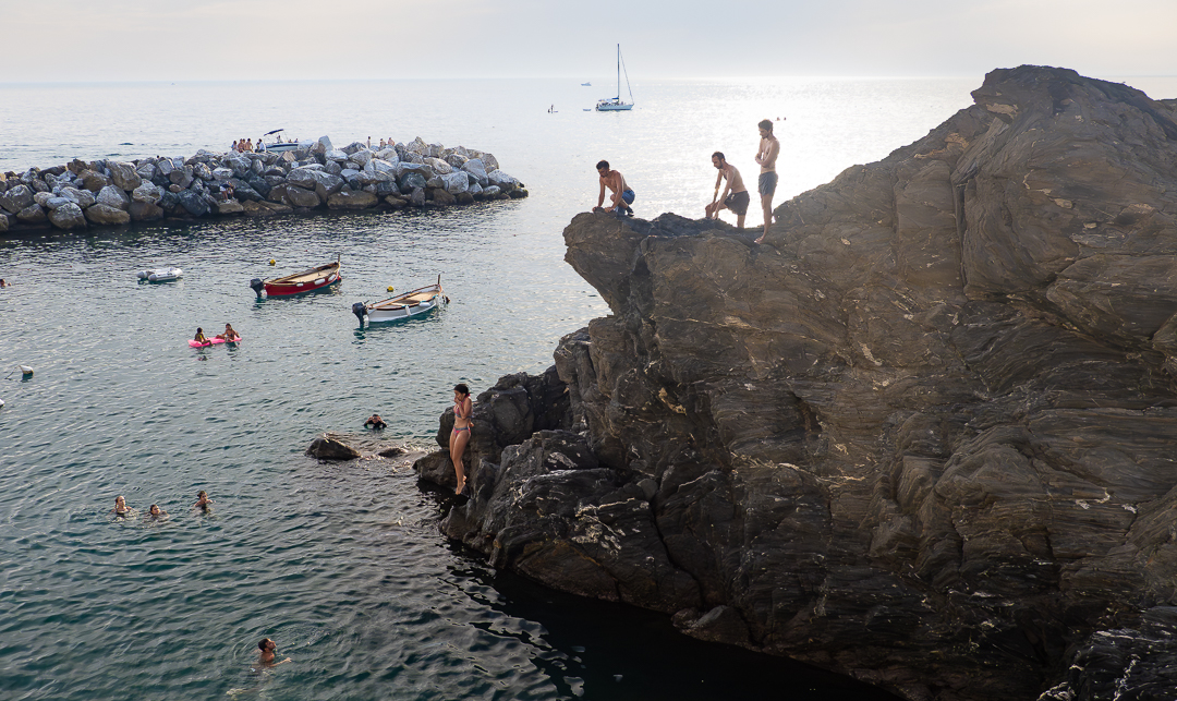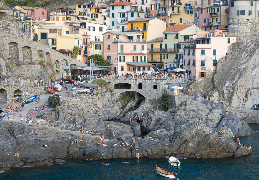 From the terrace, we watched people clambering to find a spot on the rocks to hop into the deep water. The cliff jumpers offered much distraction and entertainment while Italian tourists (the majority) alternated between sunbathing on the slipway for launching boats and swimming in the sea.