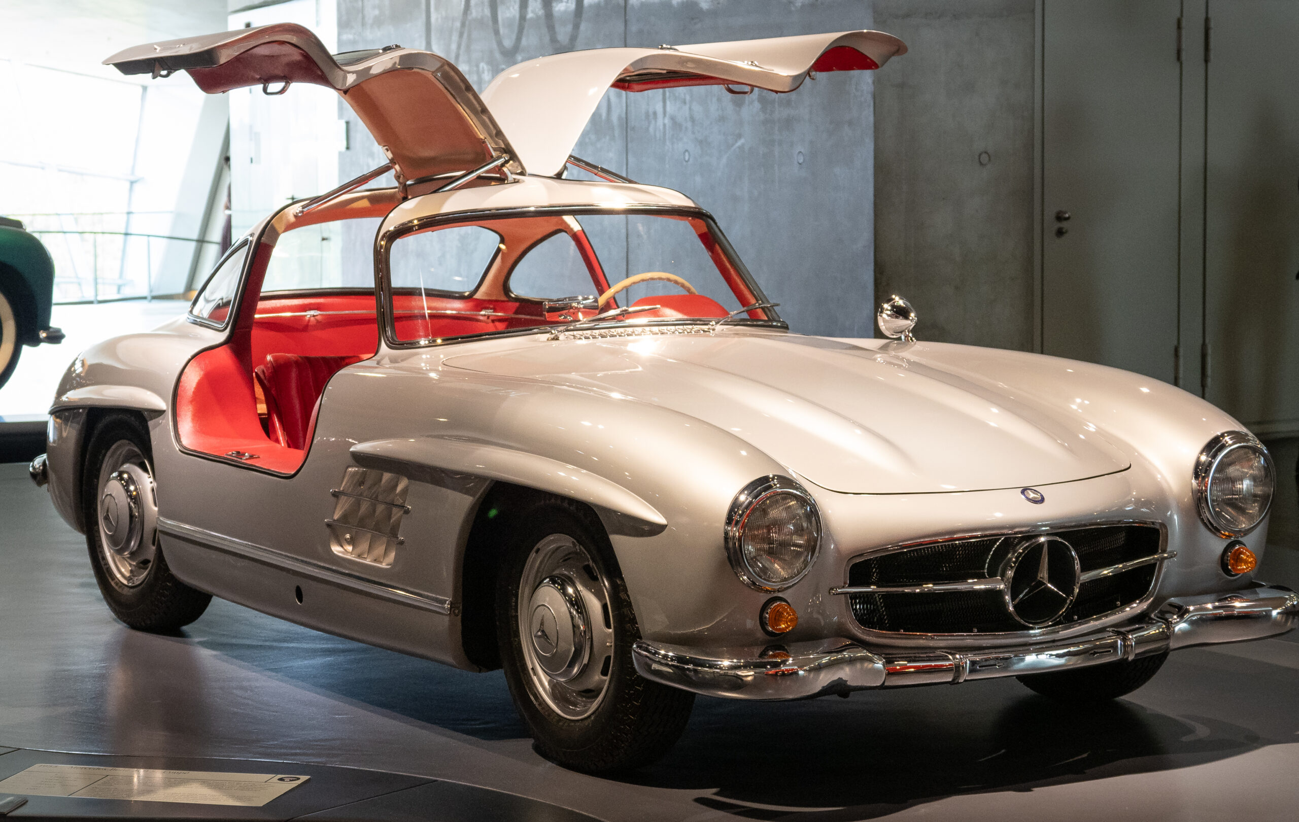 Mercedes-Benz 300 SL Coupé – the Gullwing (W198) produced between 1957-1963. SL or “super-leicht,” meaning “super-light,” is a reference to the car’s weight designed for racing. Due to the construction of the lightweight frame, the side member was quite high between the wheels, therefore prohibiting the attachment of standard doors. The gullwing door (or papillion door) was not invented by MB as it was introduced 14 years earlier by Bugatti.