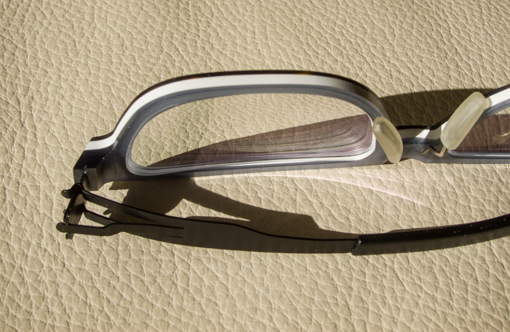 The frame is made with a three-layer sandwich of acetate resins – the one closest to the face is translucent light grey-ish blue, the middle layer is white and the outermost is imitation turtle shell. It is a big, size 56 frame.