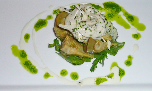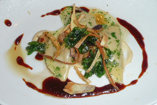 #1 – Egg in a hole (poached egg, spinach, hen-in-woods mushroom, toasted garlic)