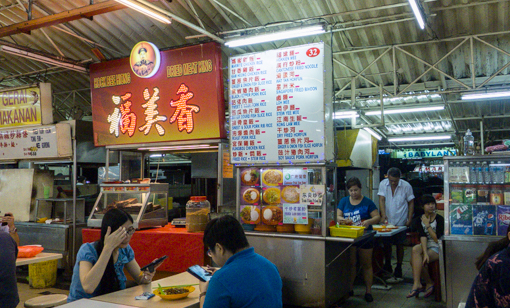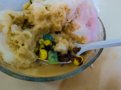 This stall sold desserts. We had the classic cendol. Wikipedia says: the dessert’s basic ingredients are coconut milk, jelly noodles made from rice flour with green food coloring (usually derived from the pandan leaf), shaved ice and palm sugar (the brown substance). Other ingredients such as red beans, glutinous rice, grass jelly, creamed corn, might also be included.