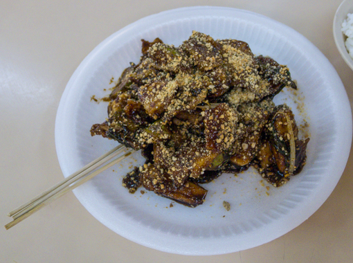 For dinner, we ordered only classic Malaysian dishes – starting with fruit rojack. The term “rojak” is Malay for mixture. According to Wikipedia, fruit rojak consists typically of cucumber, pineapple, benkoang (jicama), bean sprouts, taupok (puffy, deep-fried tofu) and youtiao (cut-up Chinese-style fritters). The thick dressing is made up of water, belacan (shrimp paste), sugar, chili, and lime juice.