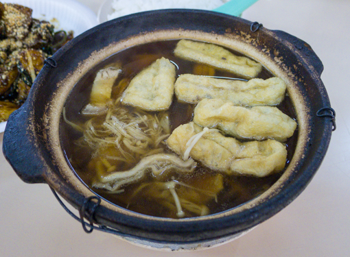 We ordered bak kut teh 肉骨茶. Wikipedia says: the name literally translates as “meat bone tea”, and at its simplest, consists of meaty pork ribs simmered in a complex broth of herbs and spices (including star anise, cinnamon, cloves, dang gui, fennel seeds and garlic) for hours. Despite its name, there is in fact no tea in the dish itself; the name refers to a strong oolong Chinese tea which is usually served alongside the soup in the belief that it dilutes or dissolves the copious amount of fat consumed in this pork-laden dish. We had fried tofu puff, enoki and dried black shitake mushrooms in our pot.