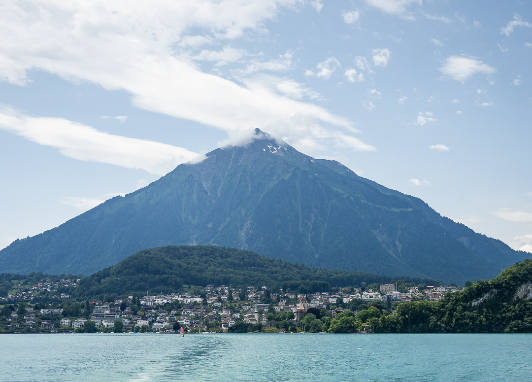 The pyramidal mountain behind Spiez is Niesen (2336 m), one of the stops on the Grand Tour of Switzerland. A funicular train (Niesenbahn) runs up to the summit from Mülenen. The view from the summit must be spectacular.