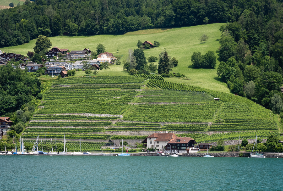 Vines and pristine pasture uphill, sailboats on the lake.