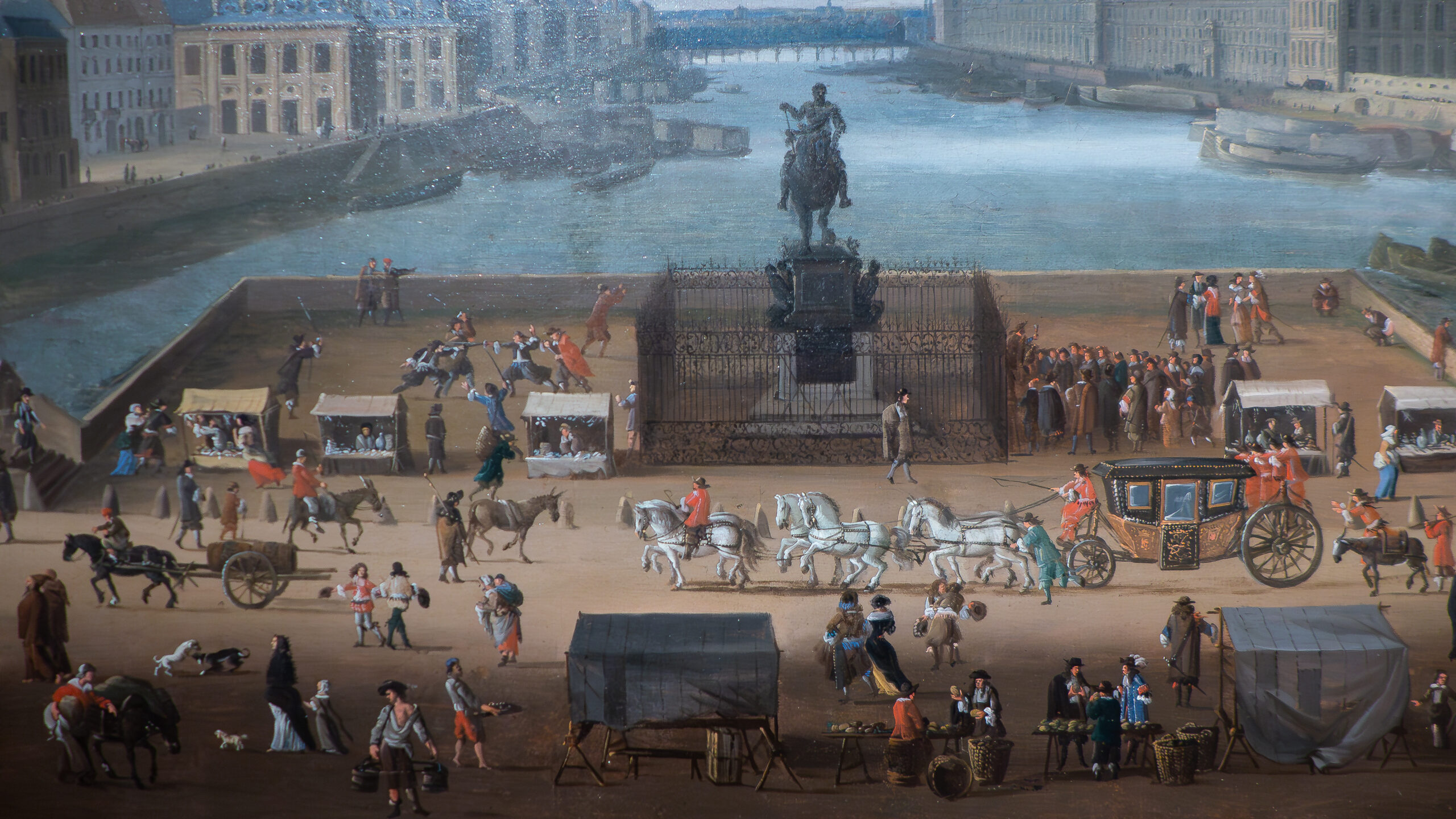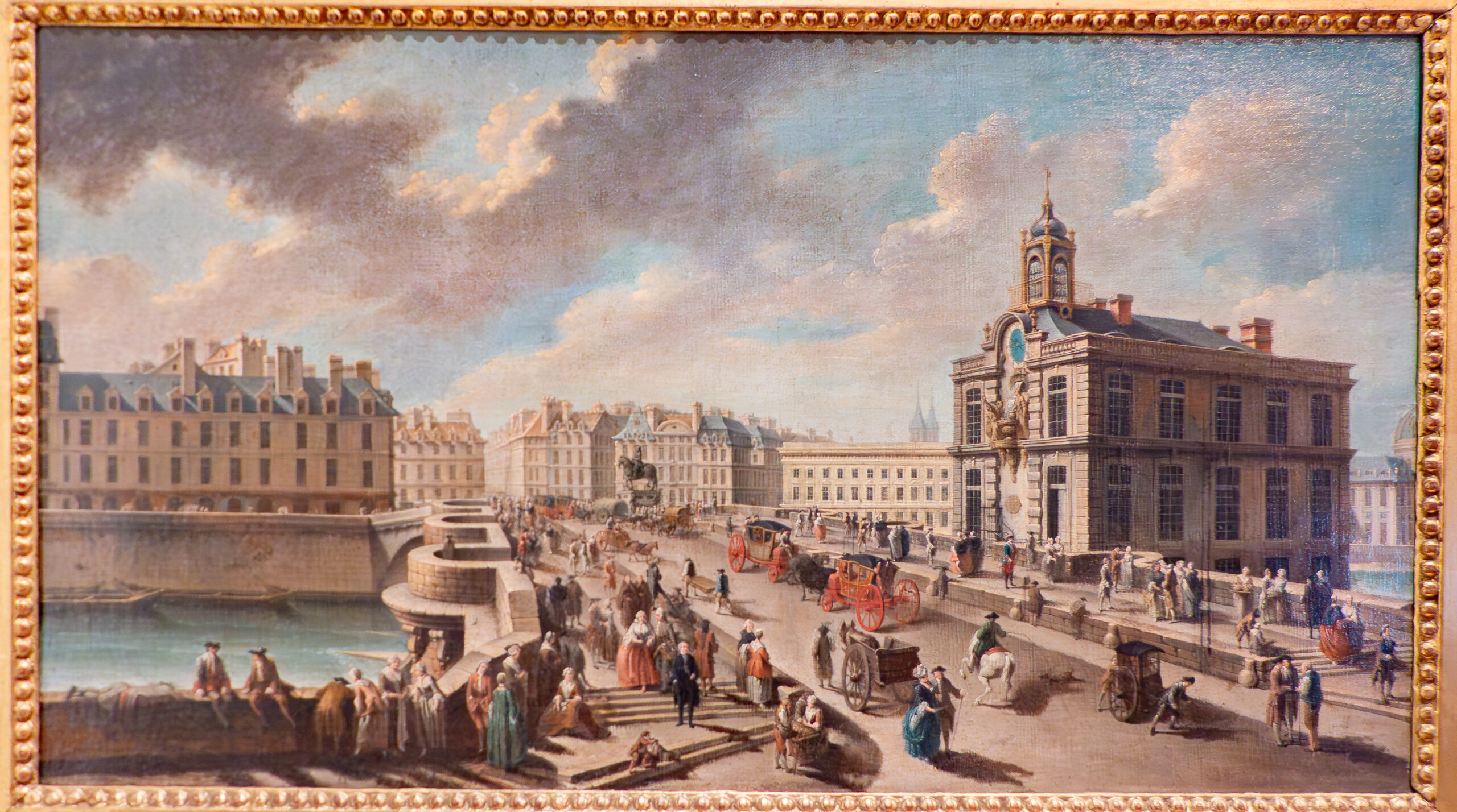 Pont Neuf, completed in 1607, was the most recent addition to the city’s bridges when the map was created—and today, it holds the distinction of being the oldest surviving bridge in its original form. Connecting the Right Bank to the western tip of Île de la Cité and continuing to the Left Bank, it was notably constructed without buildings—an innovative feature at the time—to encourage open circulation and social interaction. Two paintings in the museum vividly portray Pont Neuf and the everyday life that unfolded upon it.