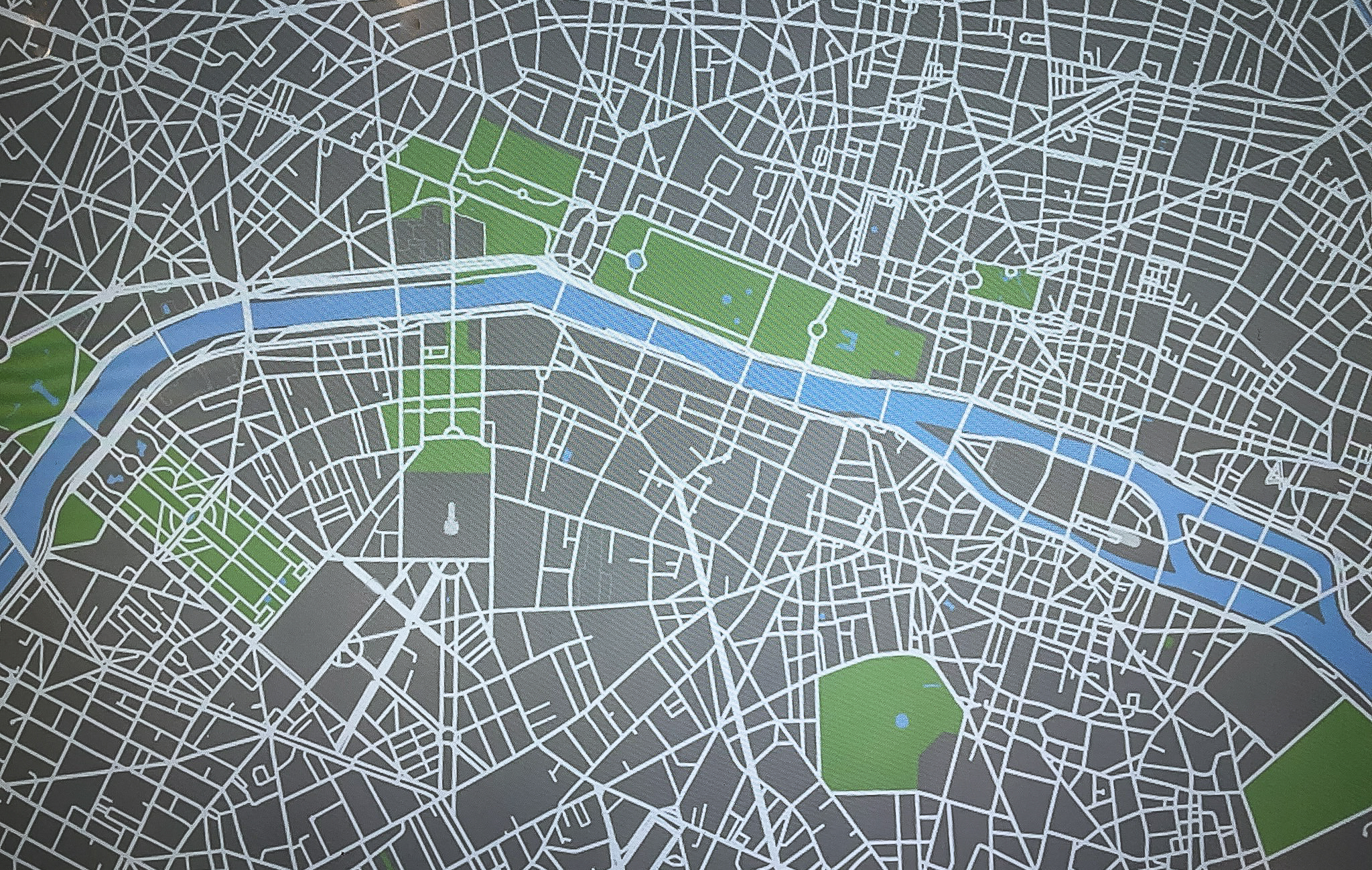 In the museum, a modern map of Paris is presented on a table with an interactive interface that allows zooming and filtering and selective display of map data.