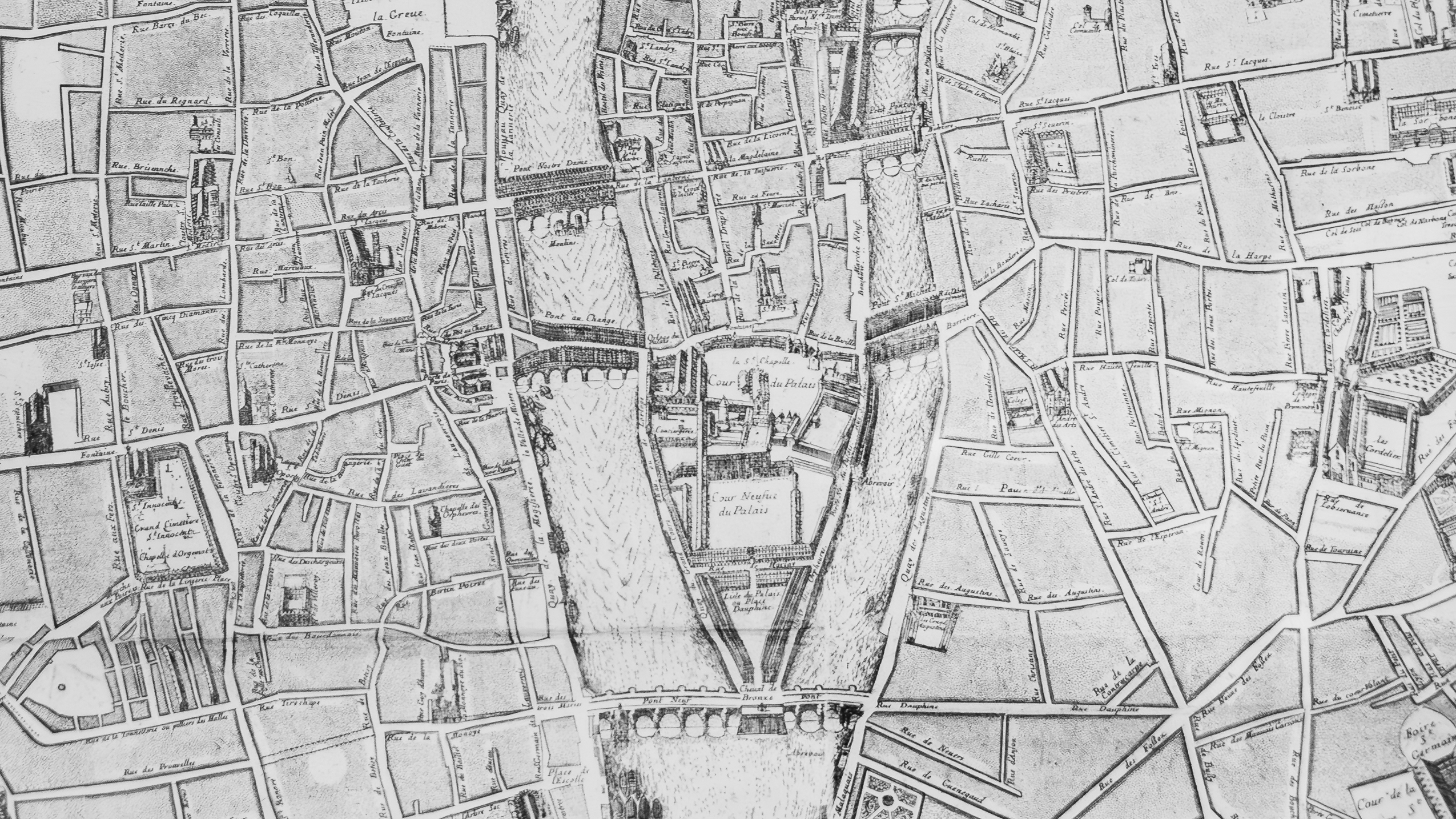 Close-up of the 1676 map shows Île de la Cité in the heart of the city, connected to both banks of the Seine by several bridges. At the top left corner is Pont Notre Dame which connects the island to the Right Bank. In the middle is Pont au Change which was lined with buildings and home to goldsmiths and money changers. Both bridges are still existent, although not in its original form.