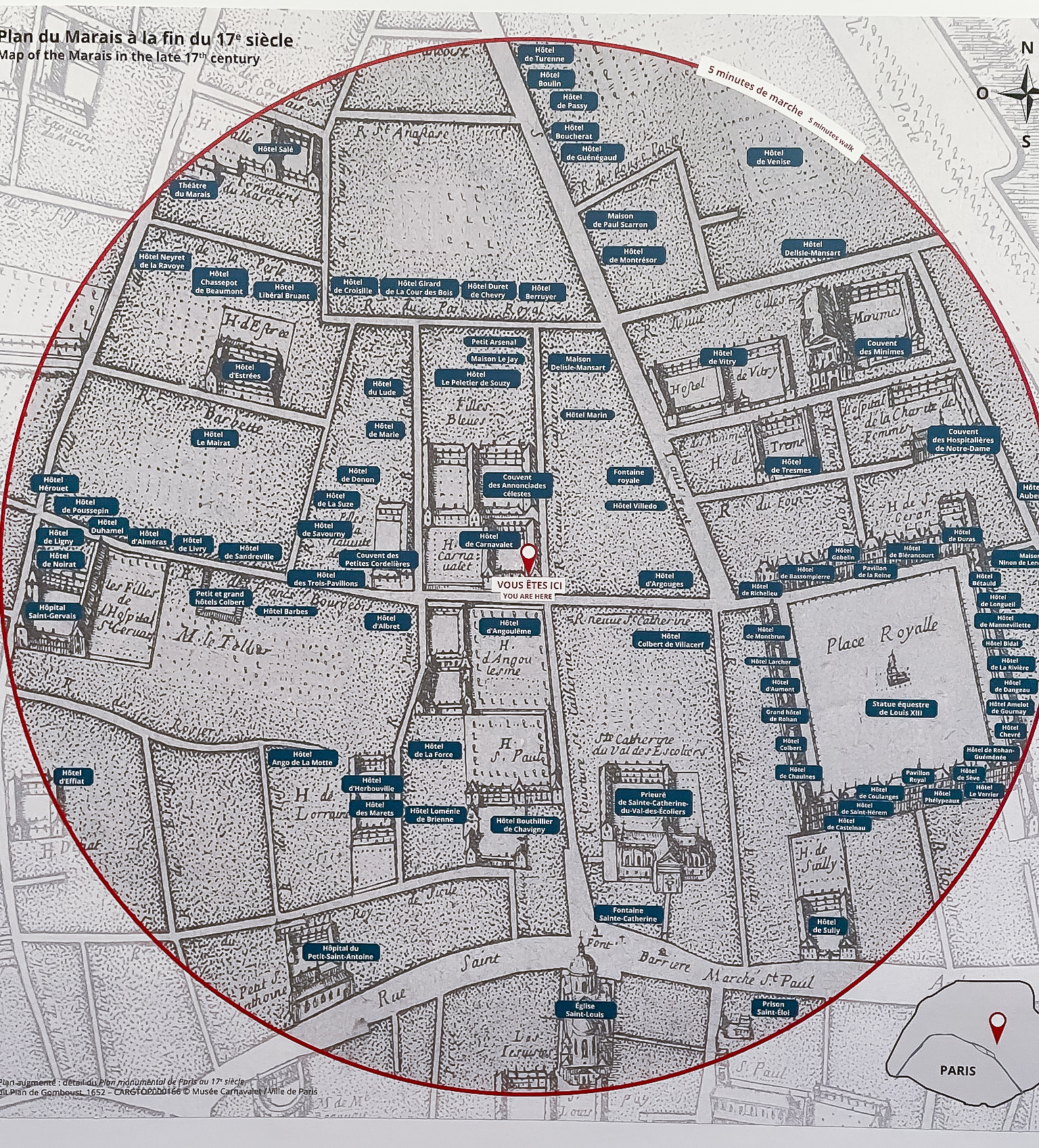 Historic Marais map from the late 17th century with labeled hôtels particuliers and a red walking-distance overlay.