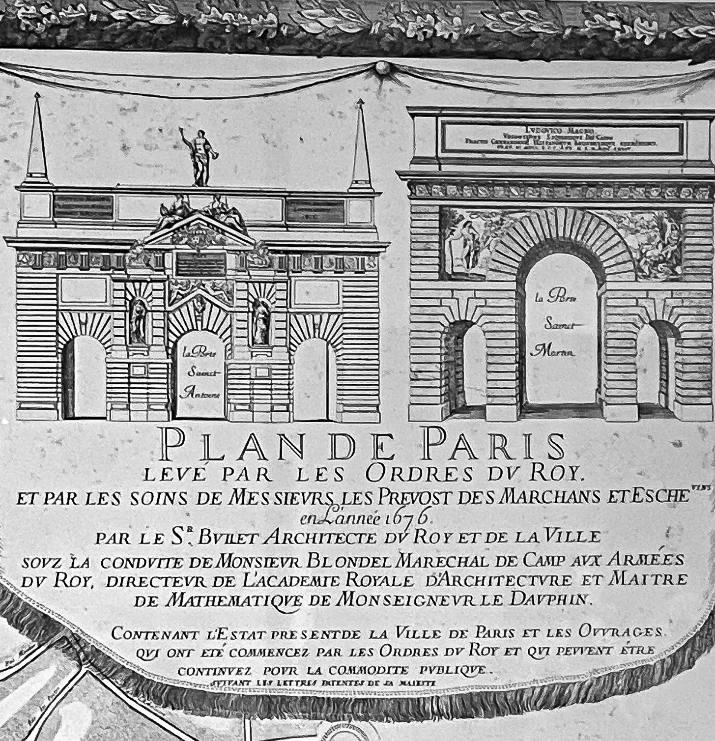 Engraved cartouche from the 1676 Paris map (top left corner of the map) showing gates Saint-Antoine and Saint-Martin. The map was created on the order of François Blondel, who is often credited as the founder of classical architectural theory in France and served as the first director of the Académie Royale d’Architecture, established in 1671.
