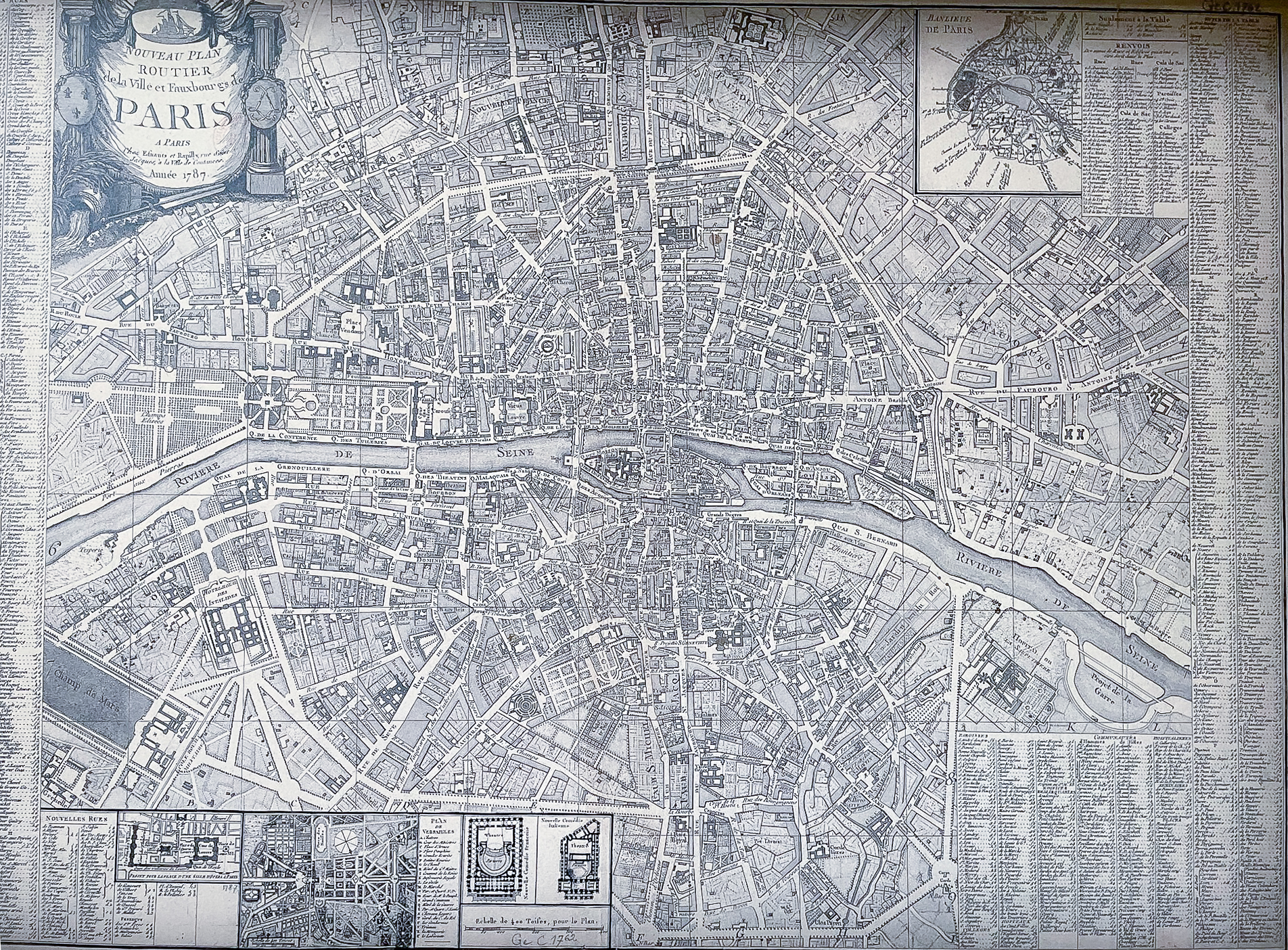 The Nouveau Plan Routier de Paris (1787), published by Esnauts et Rapilly and sold from their shop on Rue Saint-Jacques, is a richly detailed road map capturing Paris on the eve of the French Revolution. The map includes an index of streets and landmarks—typical of “routier” maps, as well as a list of new streets and a small map of the Banlieue (suburbs), a word used back then without the current social and cultural connotations.
