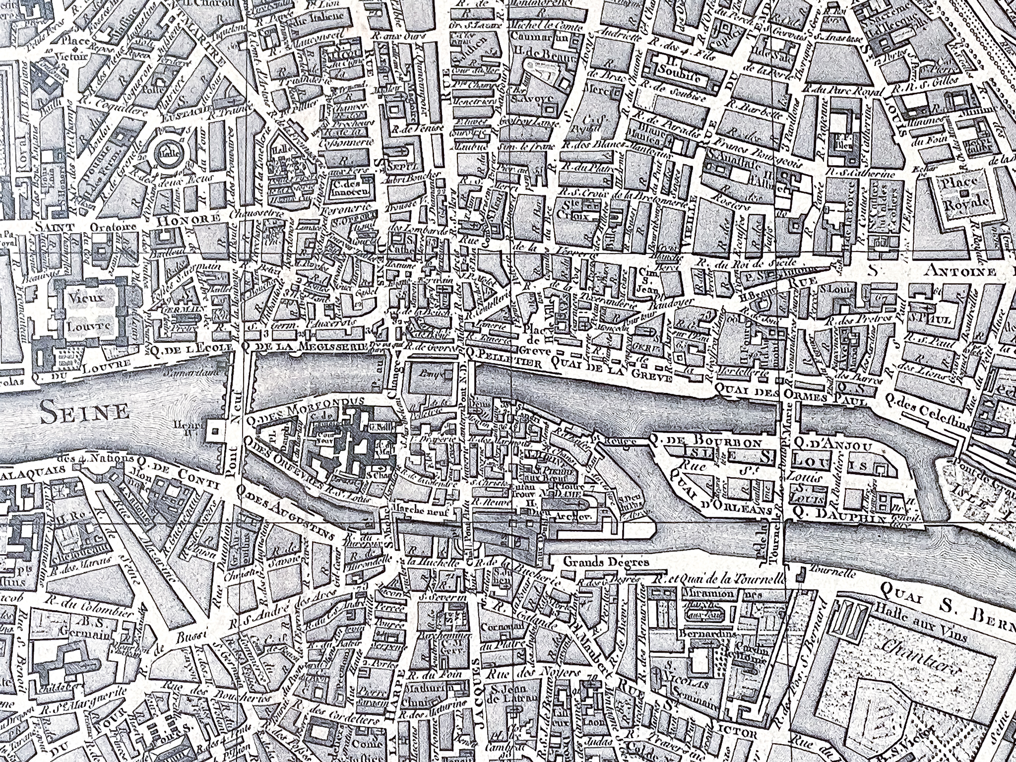 Notably, both the 1676 and 1787 maps show three islands in the Seine, the third being Île Louviers, located just east of Île Saint-Louis. Unlike its neighbors, it was never developed and was eventually integrated into the river’s north bank in 1843. A portion of it is visible in the zoomed-in map above.
