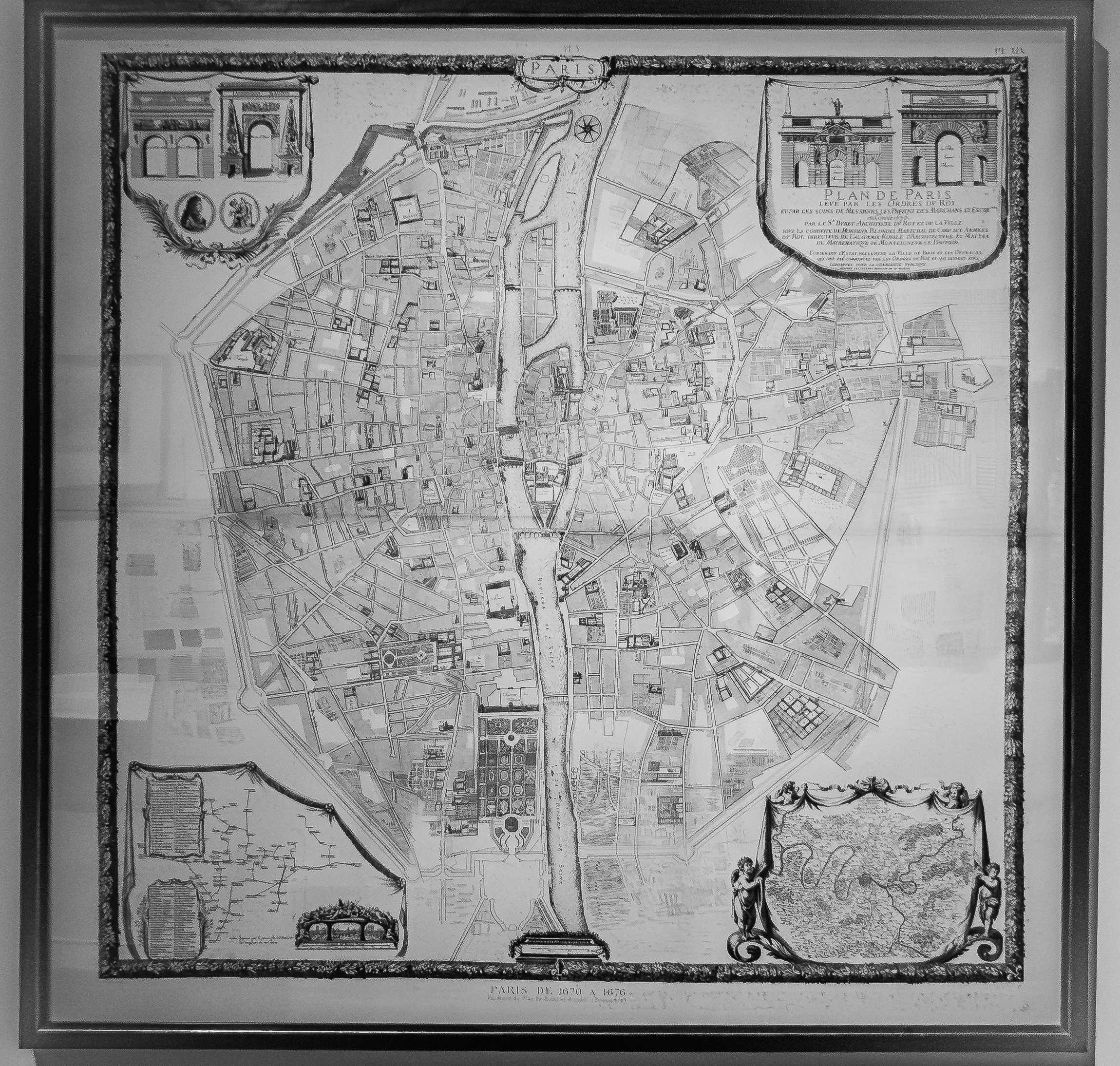 Framed reproduction of the 1676 Paris city plan, detailing buildings, gardens, and neighborhoods flanking the Seine.