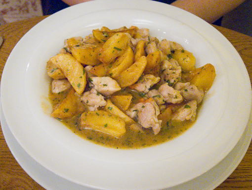 Sue ordered a chicken ragout with garlic potato. The garlic blended in with the other flavors very well. Both our main courses were very good, home-style comfort food, and strangely, neither one tasted particularly exotic or ethnic, even though we were very far from our homes.