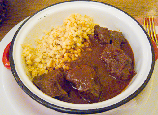 Hungarian goulash is the most famous and often cooked dish outside the borders of Hungary. So that’s what I ordered. Hungarian goulash is neither a soup nor a stew, it’s somewhere in between. Though in Hungary it’s considered a soup rather than a stew. Mine came with egg barley. A herd of cattle is gulya and herdsman is gulyás in Hungarian, so that’s where the dish’s name comes from.