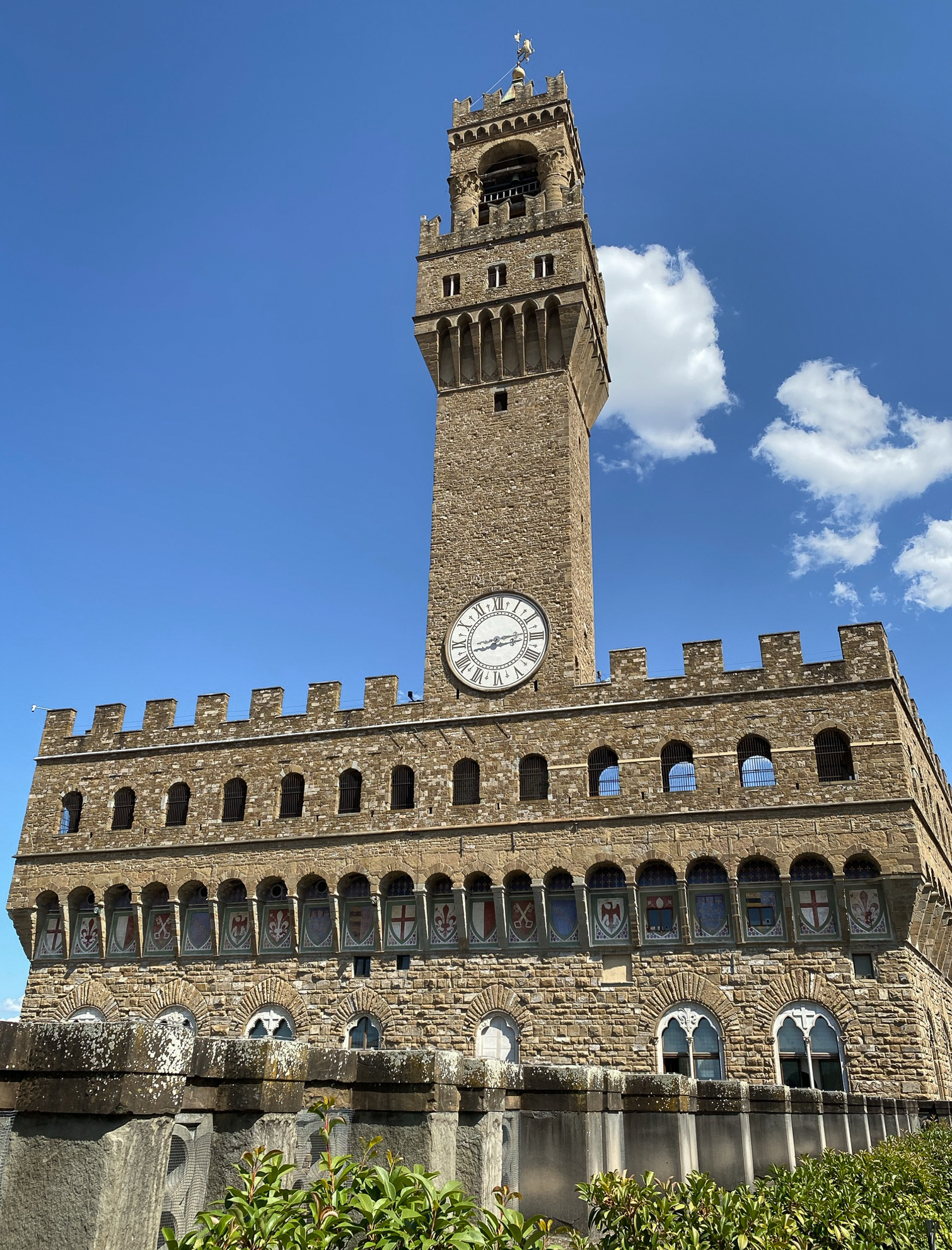 It is a solid cubical stone building with a crenellated top and a clock tower (Torre d’Arnolfo) named after the architect.