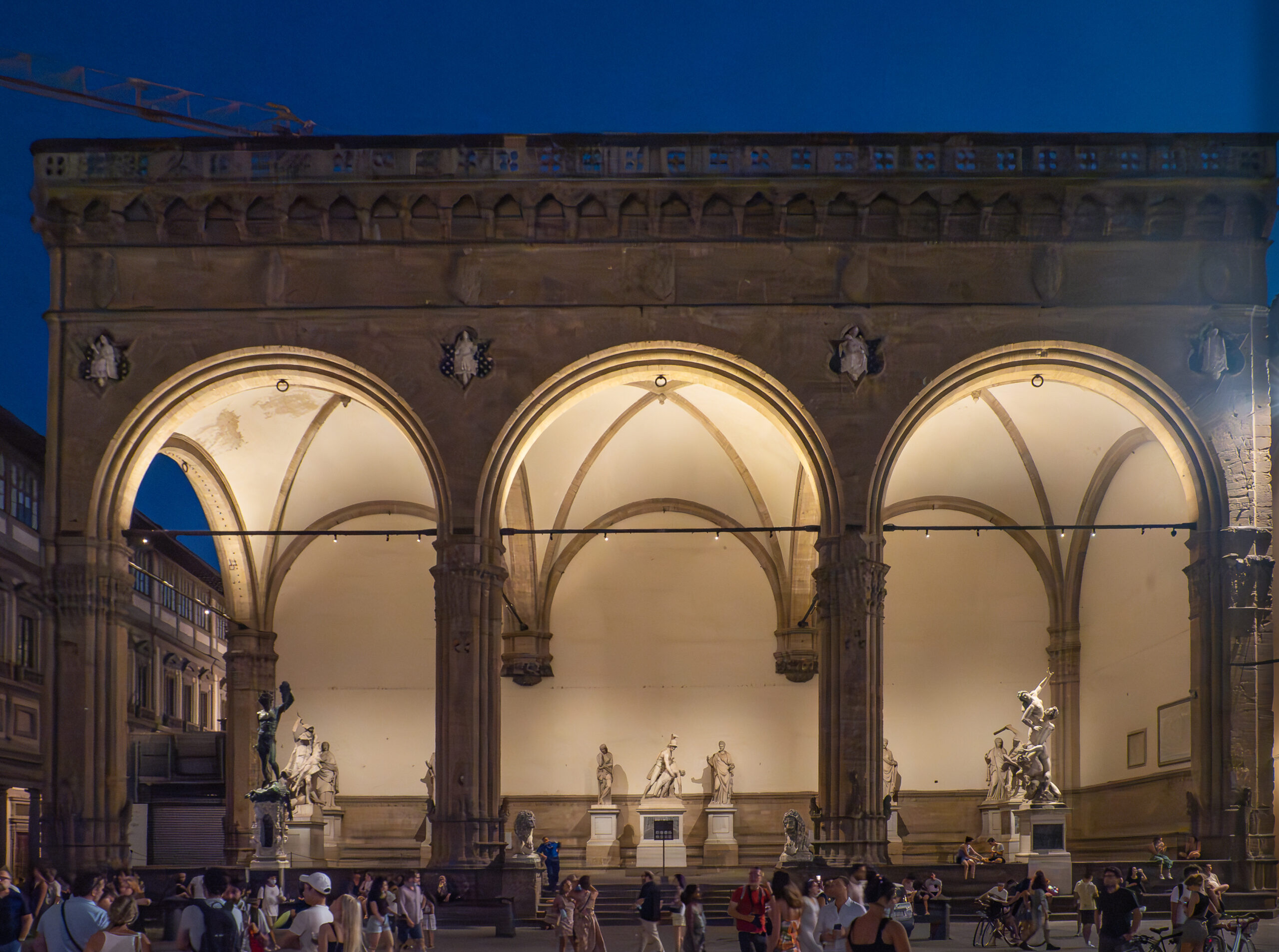 Between the Loggia dei Lanzi and Palazzo Vecchio is a narrow elongated piazza that offers access to the Uffizi Gallery, and the River Arno at the far end.