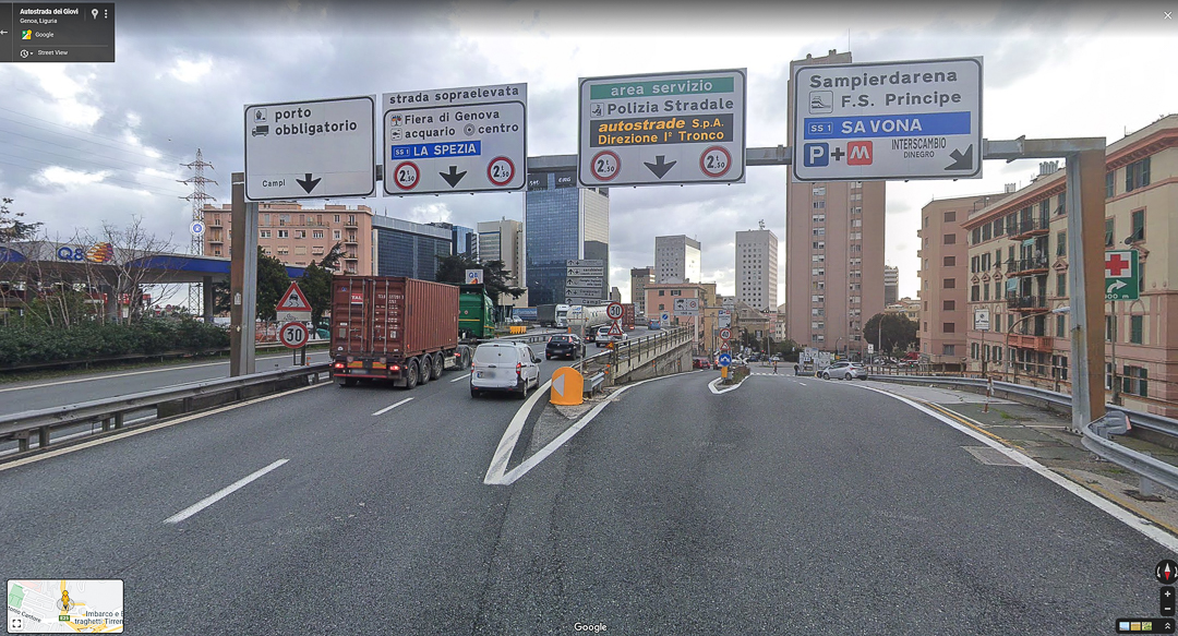 First, we headed to our hotel to drop off our luggage. The hotel was located in the Old Harbour area (Porto Antico in Italian) below the elevated road (Strada Sopraelevata). I(Chris) had carefully studied in advance the exit we had to take to get into the busy local streets from A7, using Google Streetview. We had to take the third exit counting from the left.