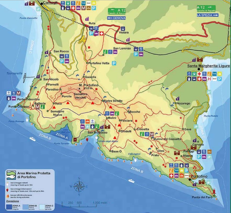 Established in 1935 on the promontory, Portofino Regional Nature Park (Parco Naturale Regionale di Portofino) offers numerous hiking trails that wind through a rugged landscape with slopes steeply dropping off onto the deep blue sea.