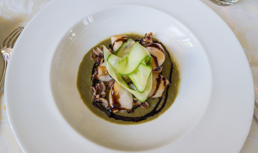 Calamaro saltato con crema di carciofi nostrani e riduzione di Balsamico (Squid sauteed with artichoke cream and balsamic reduction)