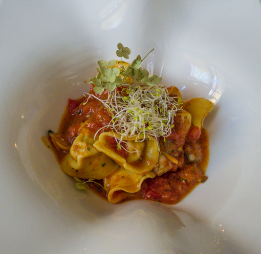 Ravioli di ricciola, pomodoro fresco, vongole veraci (yellowtail fish ravioli, fresh tomatoes, clams)