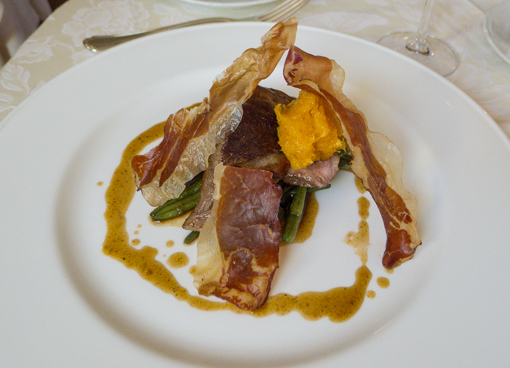 Scamone di agnello da latte in lenta cottura, albicocche, fagiolini con speck croccante (slow-cooked rump of milk lamb, apricots, green beans crunchy speck)