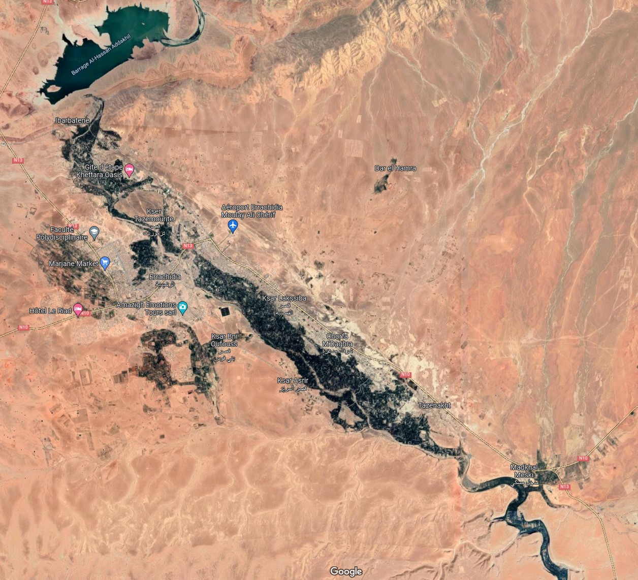 Where there is water, there are palm trees. The Ziz river around Errachidia flows like a green ribbon snaking across a vast expanse of featureless yellow background. It is essentially a very long and narrow oasis.