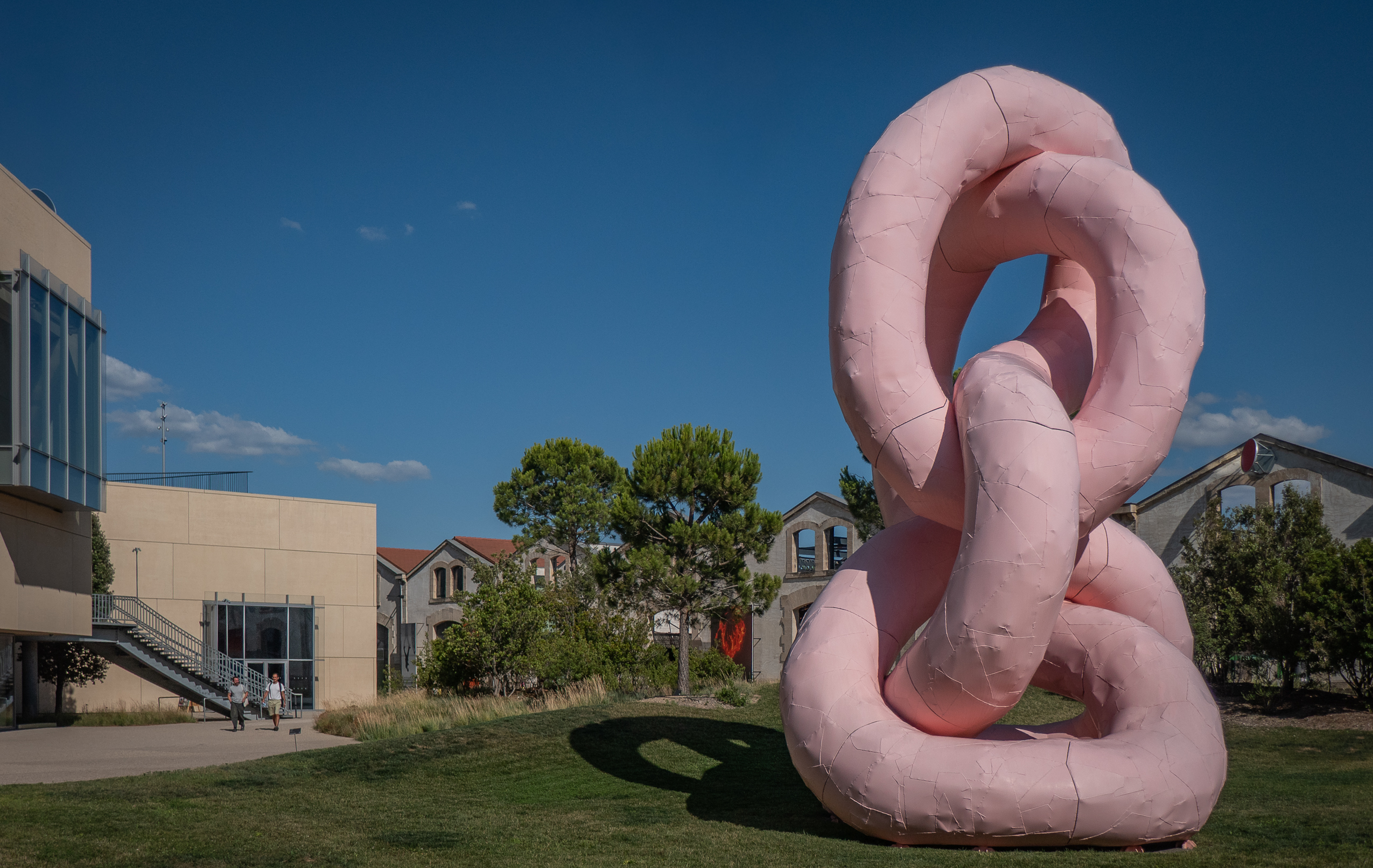 Krauses Gekröse (twisted guts) by Franz West is a 13-metre-high sculpture in pink, installed in the garden, between The Tower and the building of Les Forges.