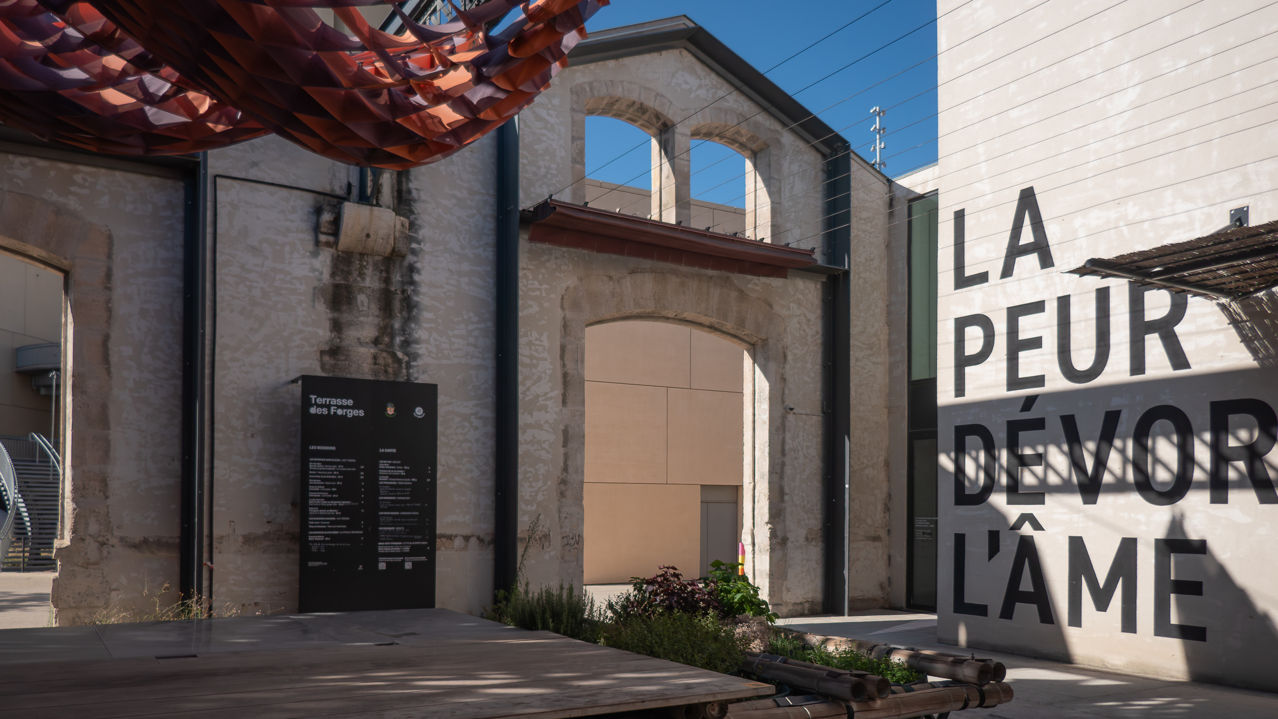 The exterior courtyard, Terrasse des Forges, located at the western end of the structure, within the original building, is a multi-purpose space that includes a café and spaces for conferences and concerts.