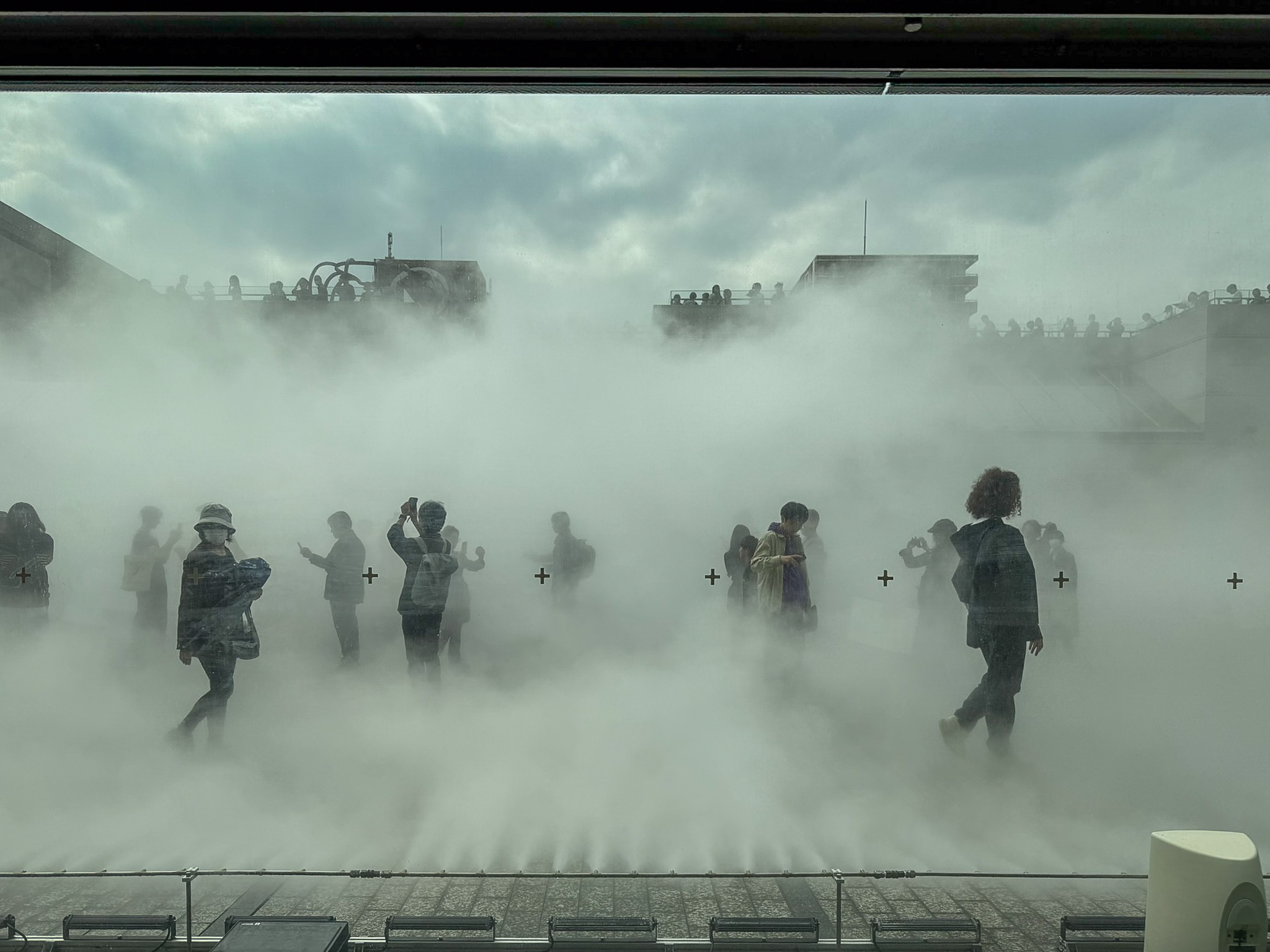 On the Sunken Terrace of MOT is a collaboration between Sakamoto, Takatani and Fujiko Nakaya. Visitors are free to be immersed in the fog while they are visible to people at the exhibition inside the building. The fog, sound and light is supposed to weave a dreamlike symphony eliciting feelings of love, respect and awe for nature.
