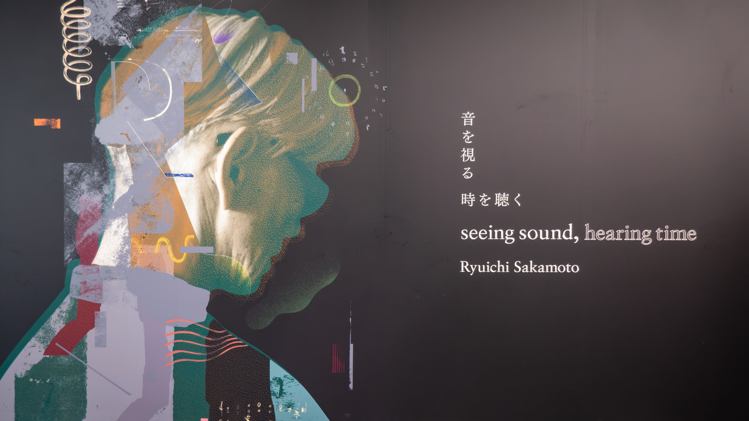 Songs from Sakamoto’s 19th solo album async (2017) play from fourteen speakers, while images and videos processed by Takatani’s “Toposcan” technique are played on a 18-meter LED wall. In one segment, Sakamoto’s personal belongings from his New York studio (piano, books, instruments) were displayed and one side is progressively “smeared” into horizontal streaks, like the pixels have been stretched into bands of abstract colored lines. In other segments where the tracks “fullmoon” and “Life, Life” are played, the spoken words in various languages were also displayed within the images.