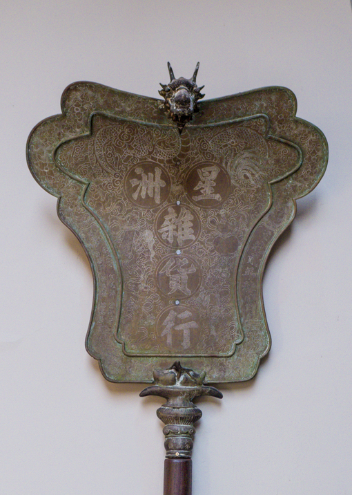 We are not sure what this metal fan was used for. It says Singapore grocery corporation. Since there were a pair of them, each with a long handle, they were likely used in a parade.