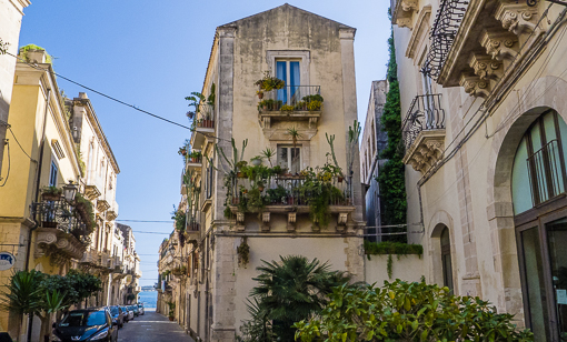 A typical narrow street on Ortigia, often with a view of the sea in the distance.