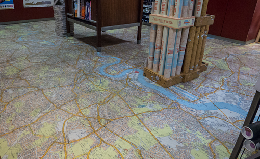 The shop uses several gigantic maps as floor covering.  This map covers the area around Greenwich of London, presumably chosen for its location being at the prime meridian,  zero longitude.