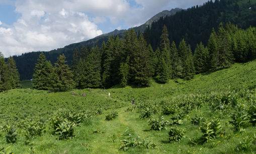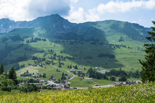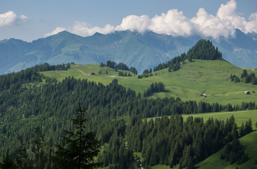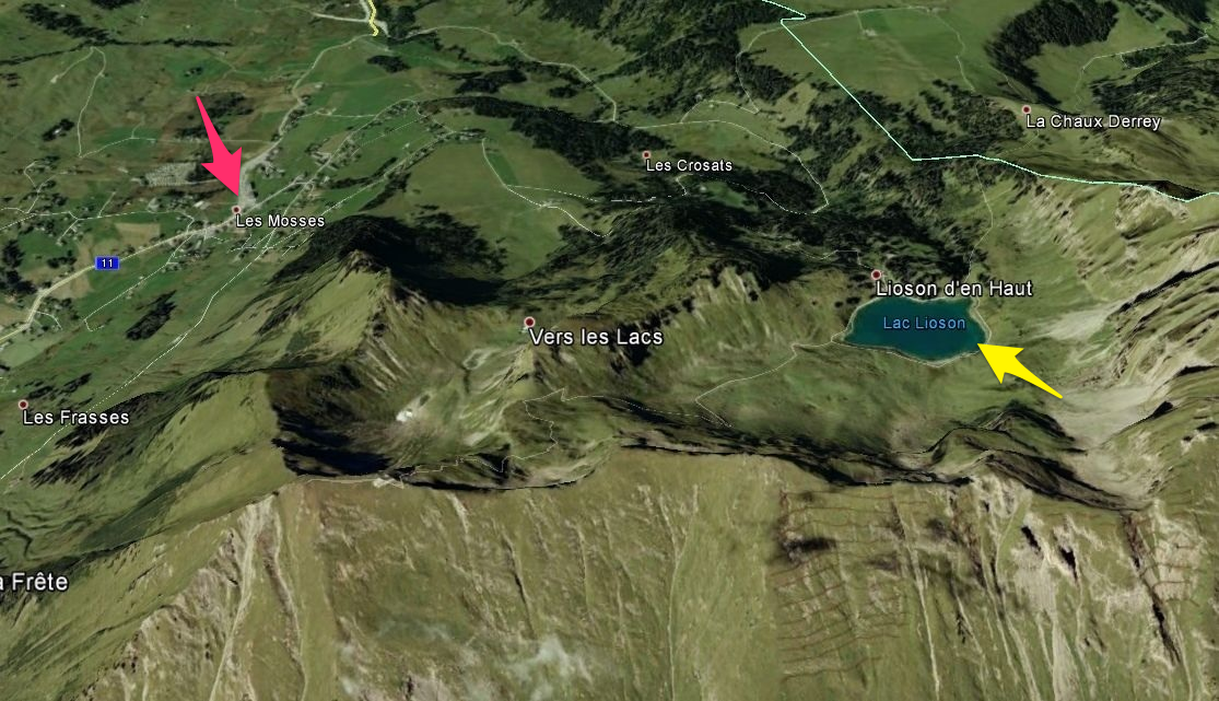The glacier lake can only be reached on foot, according to our guide book, 1.5 hours from the Col des Mosses. We left the car just off Route 11 at the village of Les Mosses (red arrow) and walked uphill to the lake (yellow arrow).