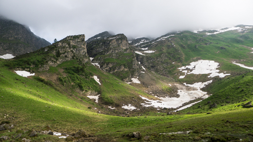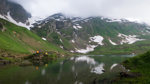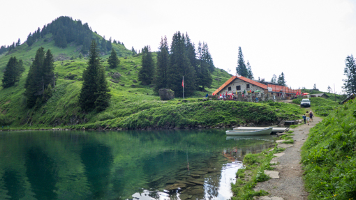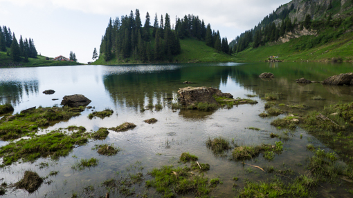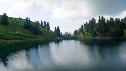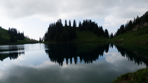 Behind the lake are slopes leading up to several peaks that are more than 2000 meters. Fog rolled in completely blocking any view of the the mountains.