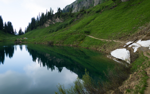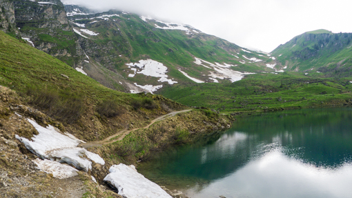 The reflection of the mountain and patches of melting snow on the lake was stunning.