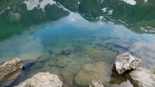 Numerous brooks and small waterfalls ringing the lake feed it with water from melting snow.