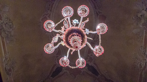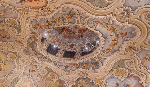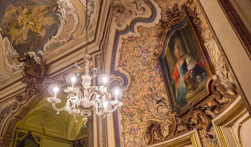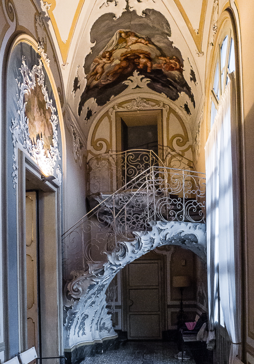The small dome, situated above the center of the ballroom, has a frescoe depicting the glories of the Paternò Castello di Biscari family. It is for use by the orchestra, and accessible through a staircase decorated in stucco within the gallery facing the sea.