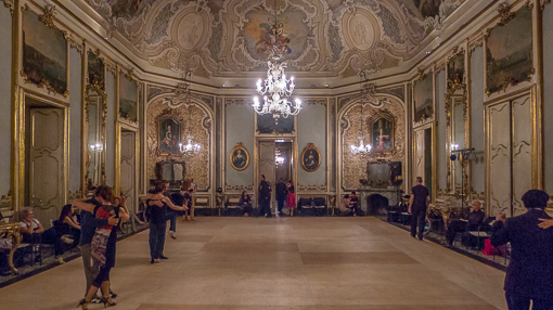 The 17th century ballroom was turned into a milonga. We suspected that they began the evening with lessons and demonstration. Judging by the stalls and racks near the entrance, we could have rented clothes and shoes and partake in the dancing if we were interested.
