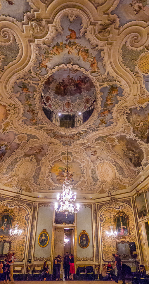 Apparently the palazzo is decorated in the late baroque style of Rococo (18th century), with a complex decoration of mirrors, stuccoes and frescoes. Our guide remarked that the Rococo style was on its way out when the palazzo was constructed since Sicily is in the countryside far away from Florence or Rome. The heart of the palace is formed by its halls, conscientiously restored after the 1991 earthquake. The paintings and frescoes were also restored to their original status.