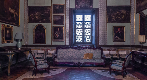 Like typical historical feudal homes, the walls are covered with paintings of members of the family going back generations, and interestingly also painted maps of the land owned by the family.