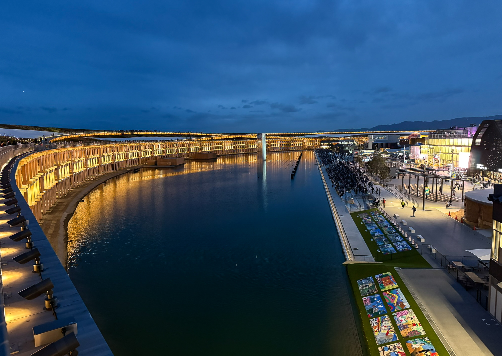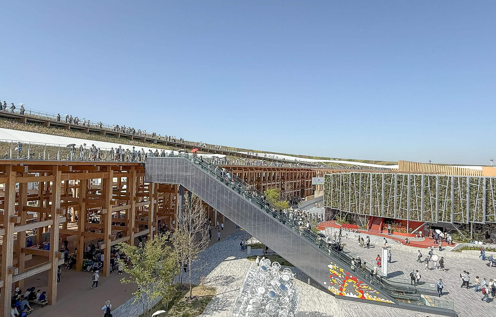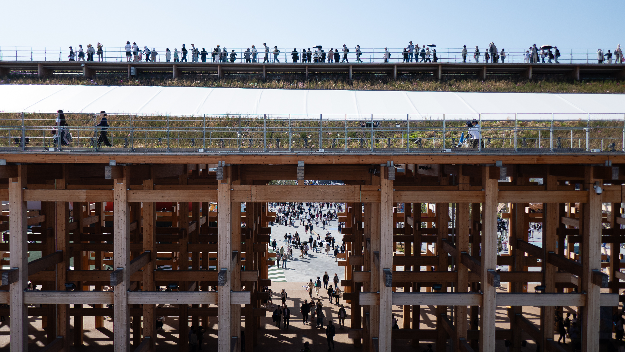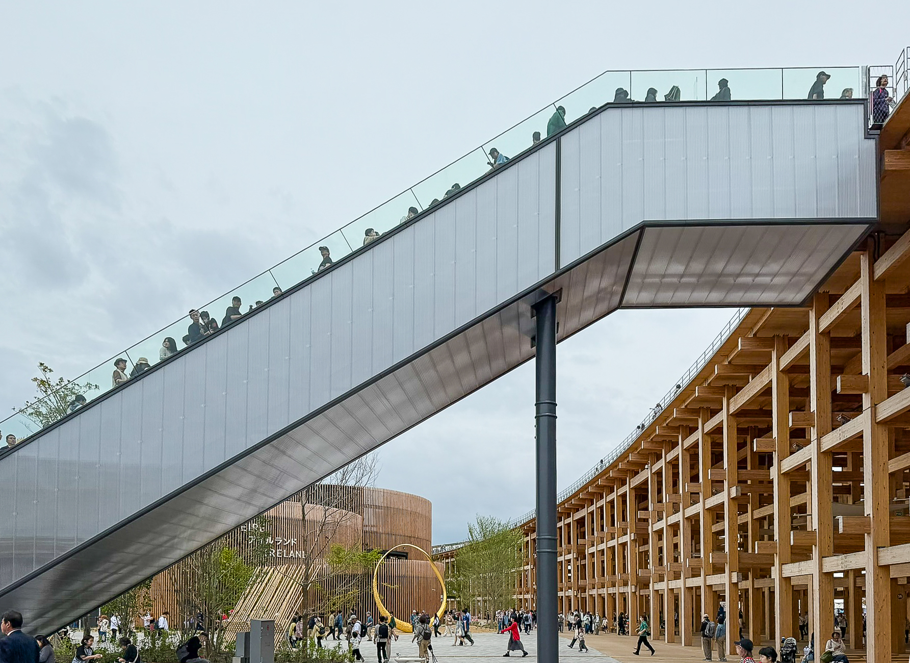 Certain sections of the Grand Ring feature a distinctive two-tiered elevated walkway design. The upper level, known as the Skywalk, is elevated approximately 12 meters above ground, offering visitors expansive views of the Expo site and Osaka Bay.