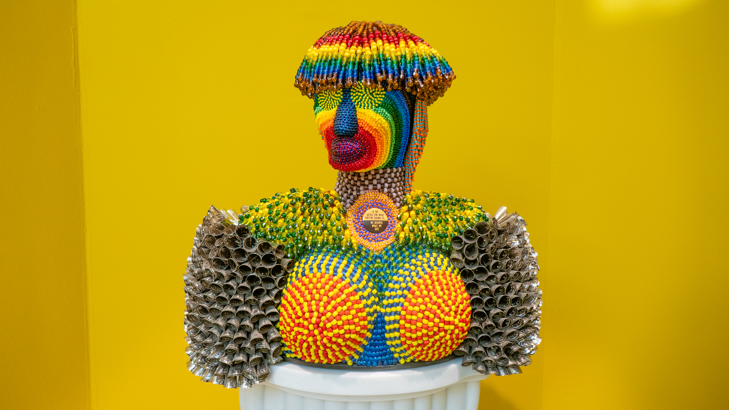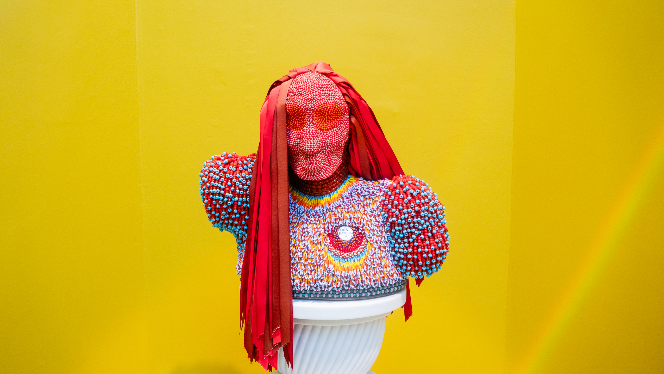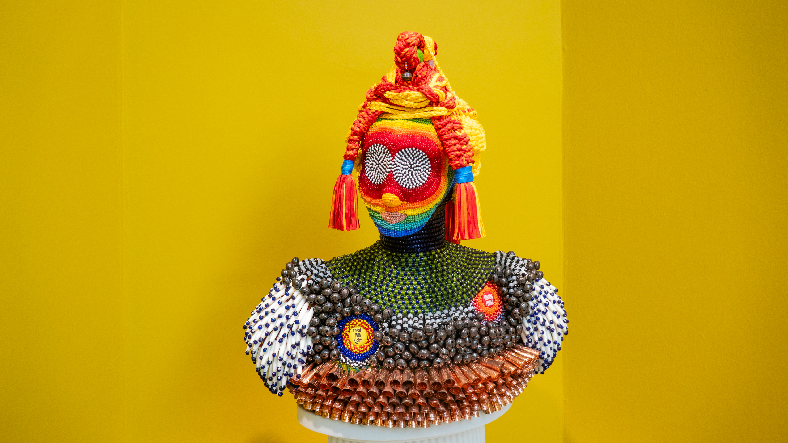 Included in the pavilion are sculptures (beaded busts), works on paper, hand-painted murals, flags, videos and multimedia paintings.