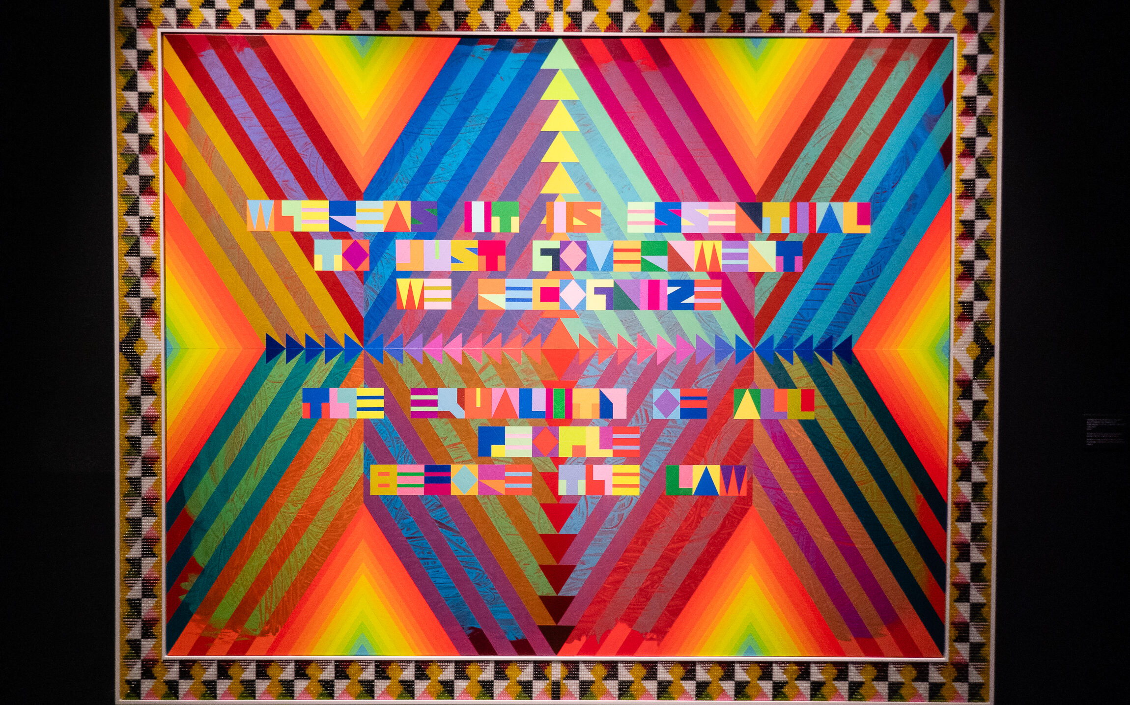 Unraveling the geometric letterforms woven into the pattern was a fun and engaging exercise—one that encouraged a slower, more thoughtful viewing. As the passage gradually emerged, its meaning had time to resonate, reminding us of the unfulfilled promises of equality in U.S. history, particularly toward Native Americans. Yet, the bold, vibrant colors infused the pavilion with a sense of hope and optimism.
