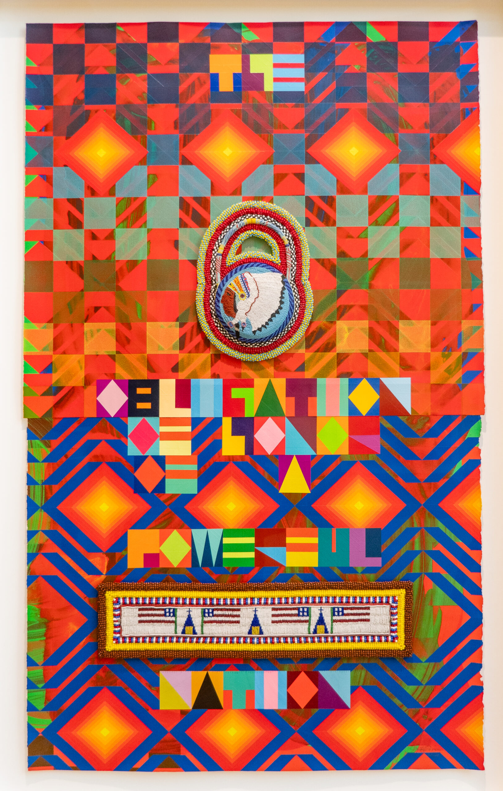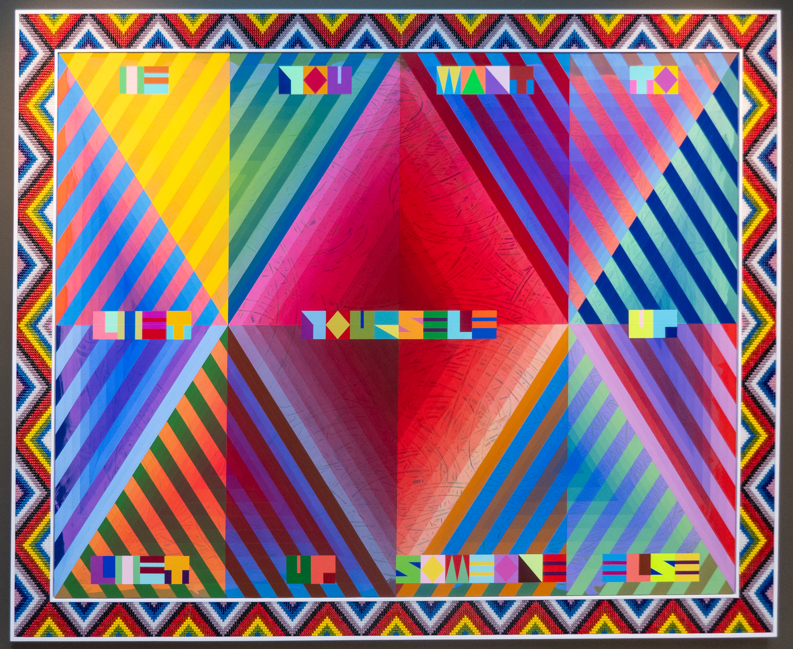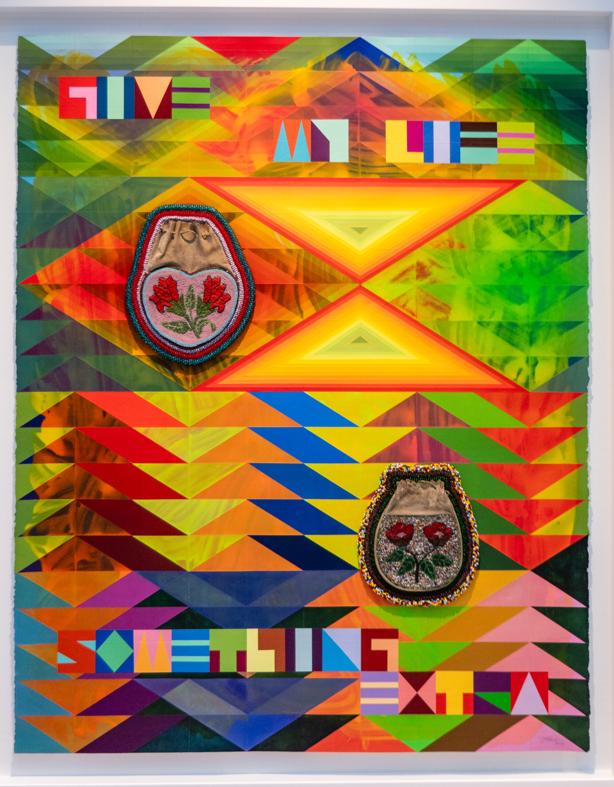 New York-based Gibson employs an interdisciplinary approach and hybrid visual language “characterized by a bold use of color, pattern, and text that combines American, Indigenous, and Queer histories with references to popular subcultures, literature, and global aesthetic and artistic traditions.” – quoted.