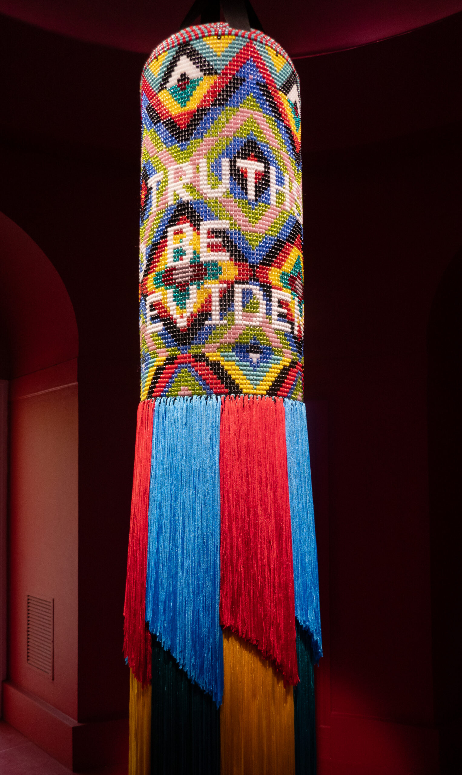 The exhibition which took over the entire pavilion is titled “the place in which to place me.” It was created by Jeffrey Gibson (1972- ), identifying as queer/gay, a native Indian of Mississippi Choctaw-Cherokee descent.