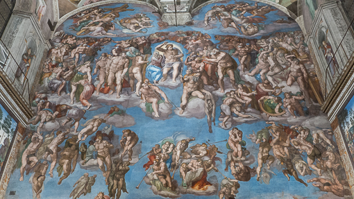 Below, appearing at the far end of the Chapel, is the next most famous painting by Michelangelo – the Last Judgement – a depiction of the Second Coming of Christ and the final and eternal judgment by God of all humanity.
