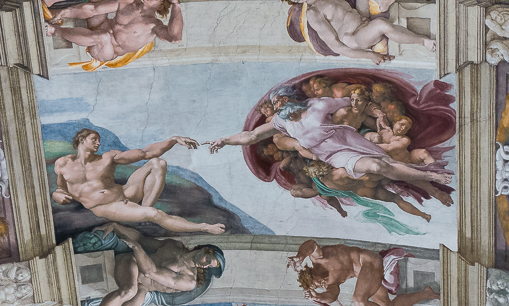 One of the most widely recognized images in the history of painting, Michelangelo shows God reaching out to touch Adam.